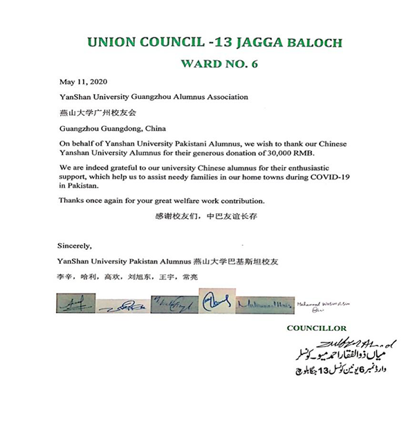 巴基斯坦当地村民委员会主任表达对燕山大学广州校友们的签字感谢