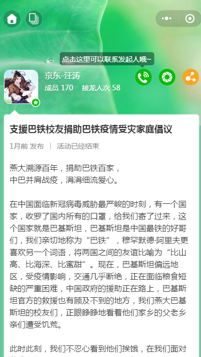 广州校友会捐助筹备组于4月19日正式通过微信小程序发起捐赠接龙,倡议广州校友进行爱心捐助,并将捐助作为庆祝溯源百年校庆的公益活动之一。至4月23日,捐赠目标30000元已经达成,所捐资金通过巴基斯坦校友汇至巴基斯坦国内,全部用于采购粮食和食品等生活必需品,并将物资分发送到巴基斯坦贫困家庭。